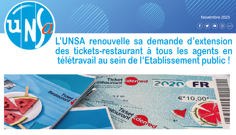L’UNSA renouvelle sa demande d’extension des tickets-restaurant à tous les agents en télétravail au sein de l‘Etablissement public !Dans un souci constant d’équité et de cohérence dans le traitement de tous les personnels de la Caisse des Dépôts, l’UNSA demande à la Direction générale d’ouvrir de nouvelles négociations avec les organisations syndicales sur l’attribution des titres-res