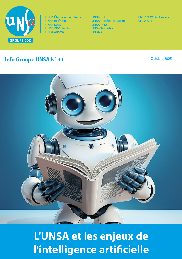 INFO GROUPE UNSA N°40Cette nouvelle édition de l’Info Groupe du groupe CDC met en avant l’es résultats exceptionnels de 2025 l’Intelligence Artificielle. Ce sujet n’est plus une projection futuriste mais une réalité bien concrète au sein de notre Etablisseme