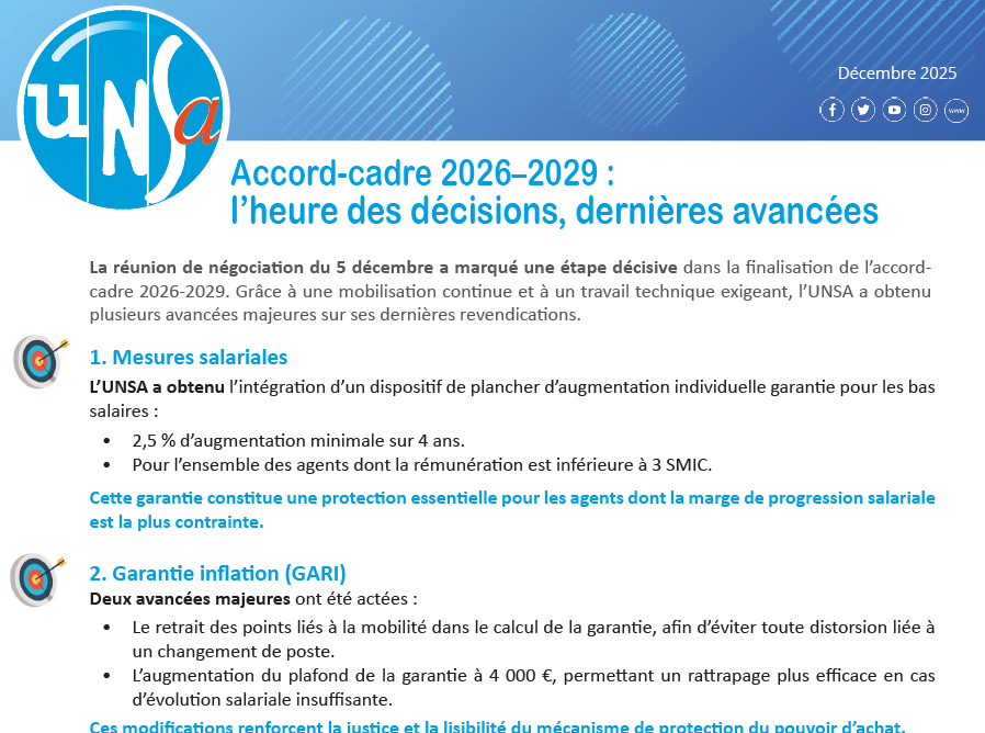 Accord-Cadre 2026–2029 : l’heure des décisions, dernières avancéesLa réunion de négociation du 5 décembre a marqué une étape décisive dans la finalisation de l’accord-cadre2026-2029. Grâce à une mobilisation continue et à un travail technique exigeant, l’UNSA a obtenuplusieurs avancées majeures sur ses dernières revendi