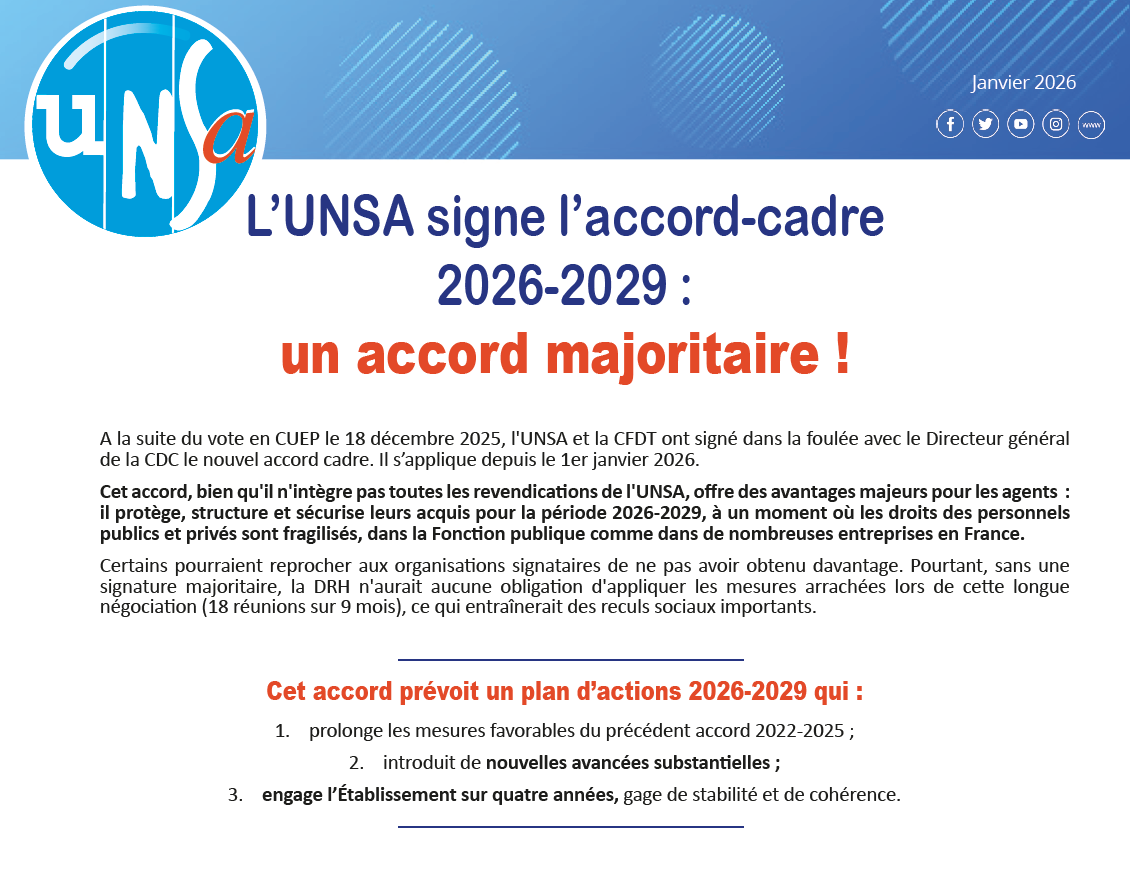 Accord-Cadre 2026–2029 : un accord majoritaire !A la suite du vote en CUEP le 18 décembre 2025, l’UNSA et la CFDT ont signé dans la foulée avec le Directeur général de la CDC le nouvel accord cadre. Il s’applique depuis le 1er janvier 2026. Cet accord, bien qu’il n’intègre pas toutes