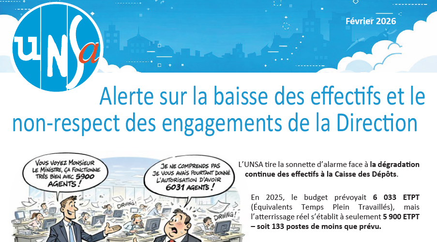 Budget 2026 : Alerte sur la baisse des effectifs et le non-respect des engagements de la DirectionL’UNSA tire la sonnette d’alarme face à la dégradation continue des effectifs à la Caisse des Dépôts. En 2025, le budget prévoyait 6 033 ETPT (Équivalents Temps Plein Travaillés), mais l’atterrissage réel s’établit à seulement 5 900 ETPT – soit&